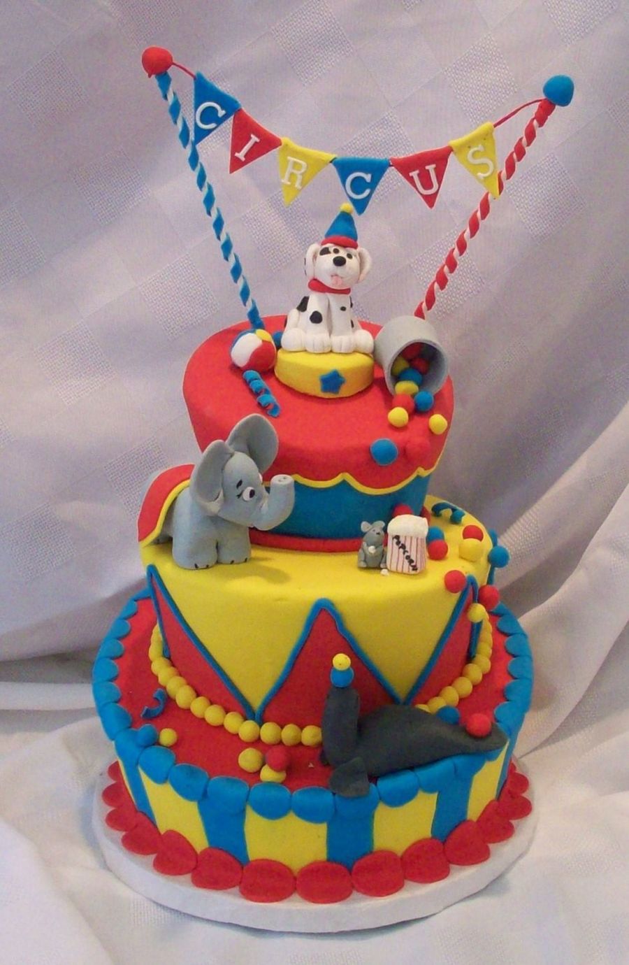 This was my entry for the Kansas State Fair (and our county fair). I got first place at both fairs in my category! This was also my first topsy turvy cake. A real learning experience. It's all fondant covered with fondant/gumpaste animals. Oh, in the state fair, I wasn't able to use the banner due to height restrictions. Thanks for looking!