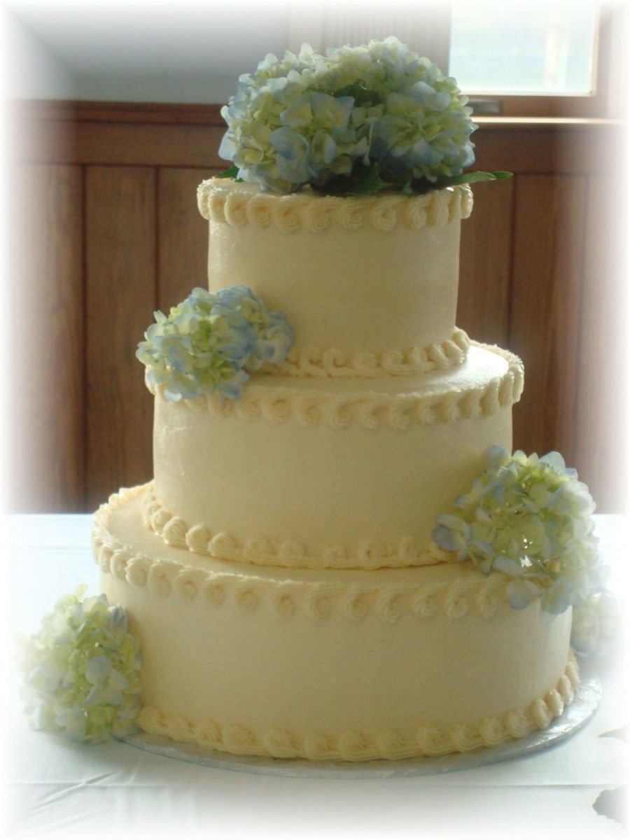White cake with raspberry filling, ivory buttercream and fresh hydrangea.