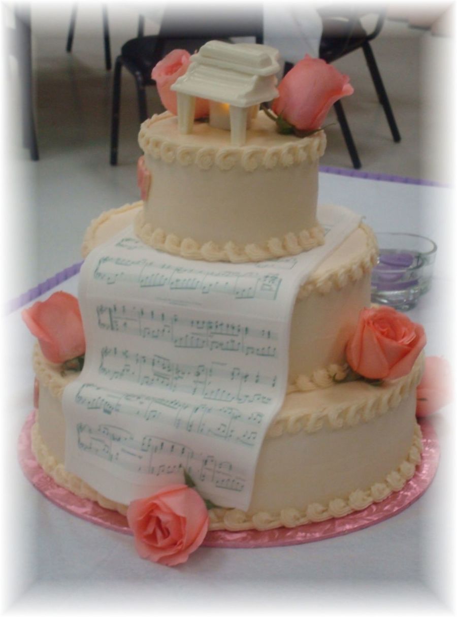 Yellow cake with white chocolate piano, fondant sheet music.