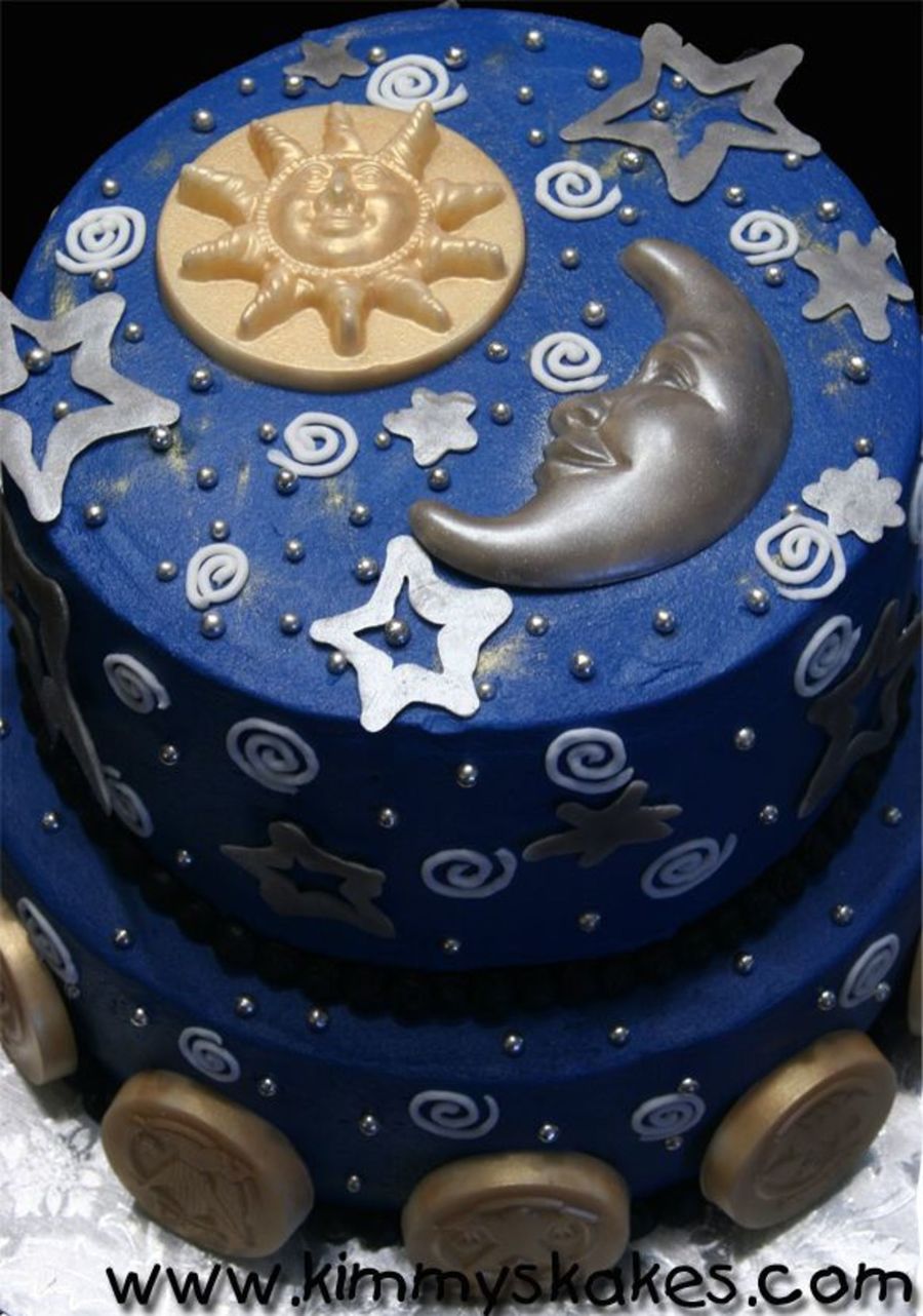 10" & 8" rounds covered in bc. The bday girl is interested in spiritual stuff so I added the sun, moon and stars, as well as the zodiac symbols around the cake. They are all made from chocolate and covered in luster dust.