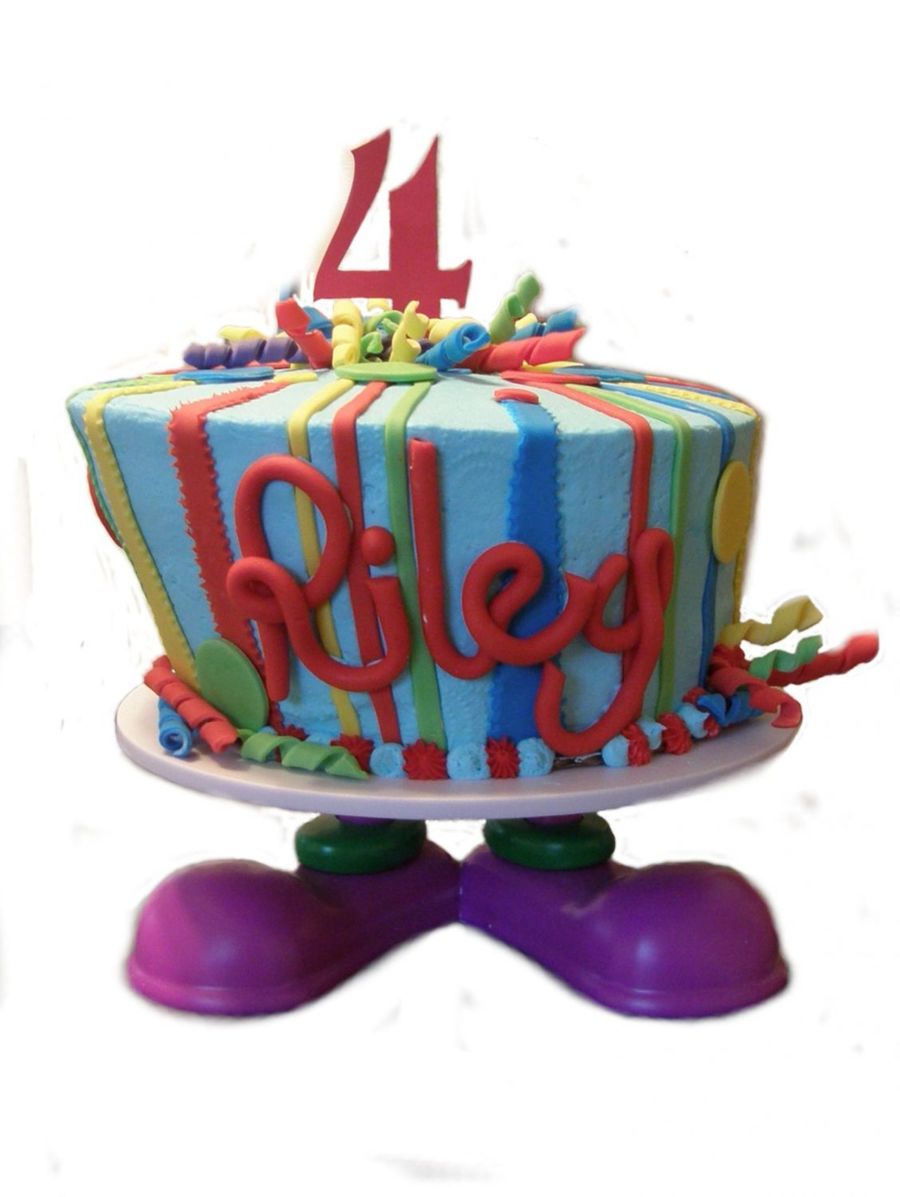 8", 9". 10" cake carved in whimsy for a "colorful" themed birthday. White cake with BC and fondant extras. Only thing not edible is the "4" printed on cardstock and held with a popsicle stick =]
