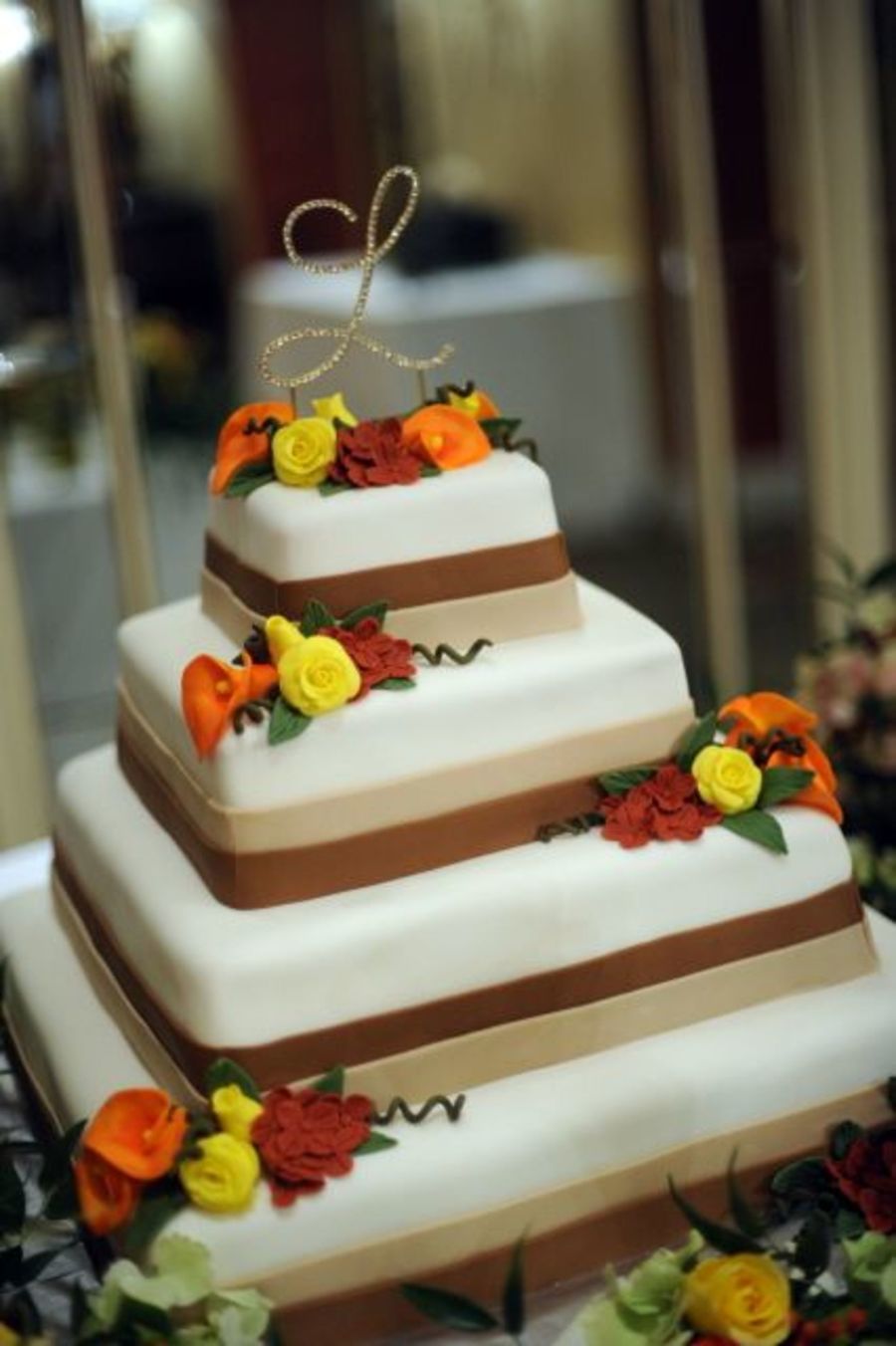 18/14/10/6 squares. All white cake filled with a variety of bavarain cream, pineaple, and strawberry fillings. Covered in all fondant. 50/50 Fondant callas, roses and hydrangeas. Thanks to Studio Tran for the picture!