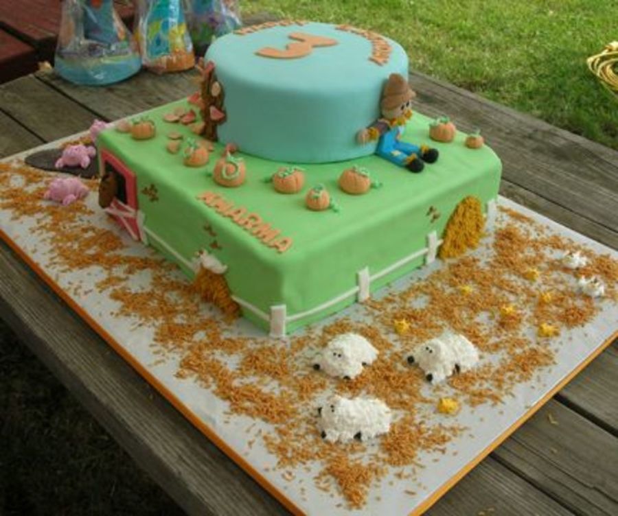 This cake was for a 3rd birthday party at a pumpkin patch. Bottom tier is chocolate and represents the animals on the farm. Covered in fondant with royal icing animals. Top tier is yellow and represents the pumpkin patch. There are trees with fondant leaves, fondant pumpkins and a scarecrow.