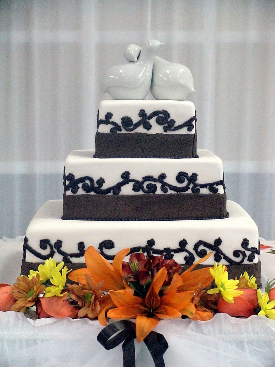 Rum cake top tier, chocolate cake with chocolate ganash filling for the second tier and Red Velvet for the bottom tier. Covered in fondant with chocolate BC piping.