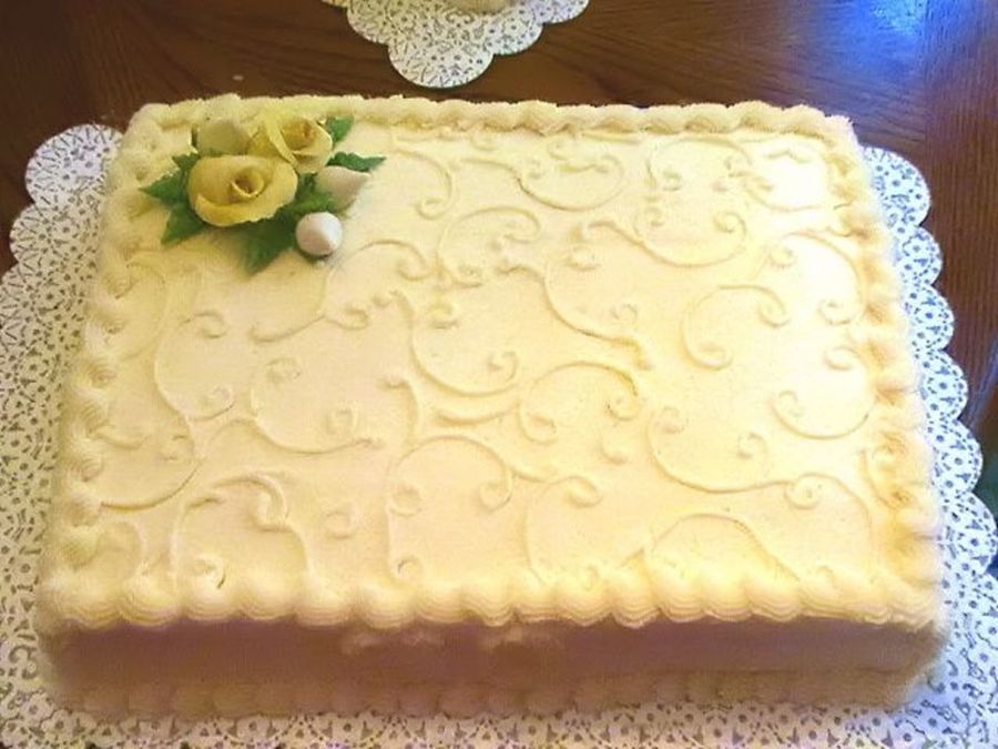 This cake is a triple fudge cake torted and filled with cheesecake whipped cream filling and iced entirely in butter cream. Hand crafted gum paste floral. TFL