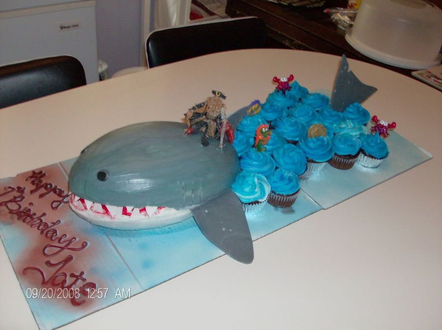 Wanted a shark cake, so I gave him one. It is supposed to resemble a shark coming up out of the water. all buttercream except for eyes and fins, which were fondant. colored the cake in the shark red so that it would "bleed" for him when he cut it. He is a HUGE Jaws fan.