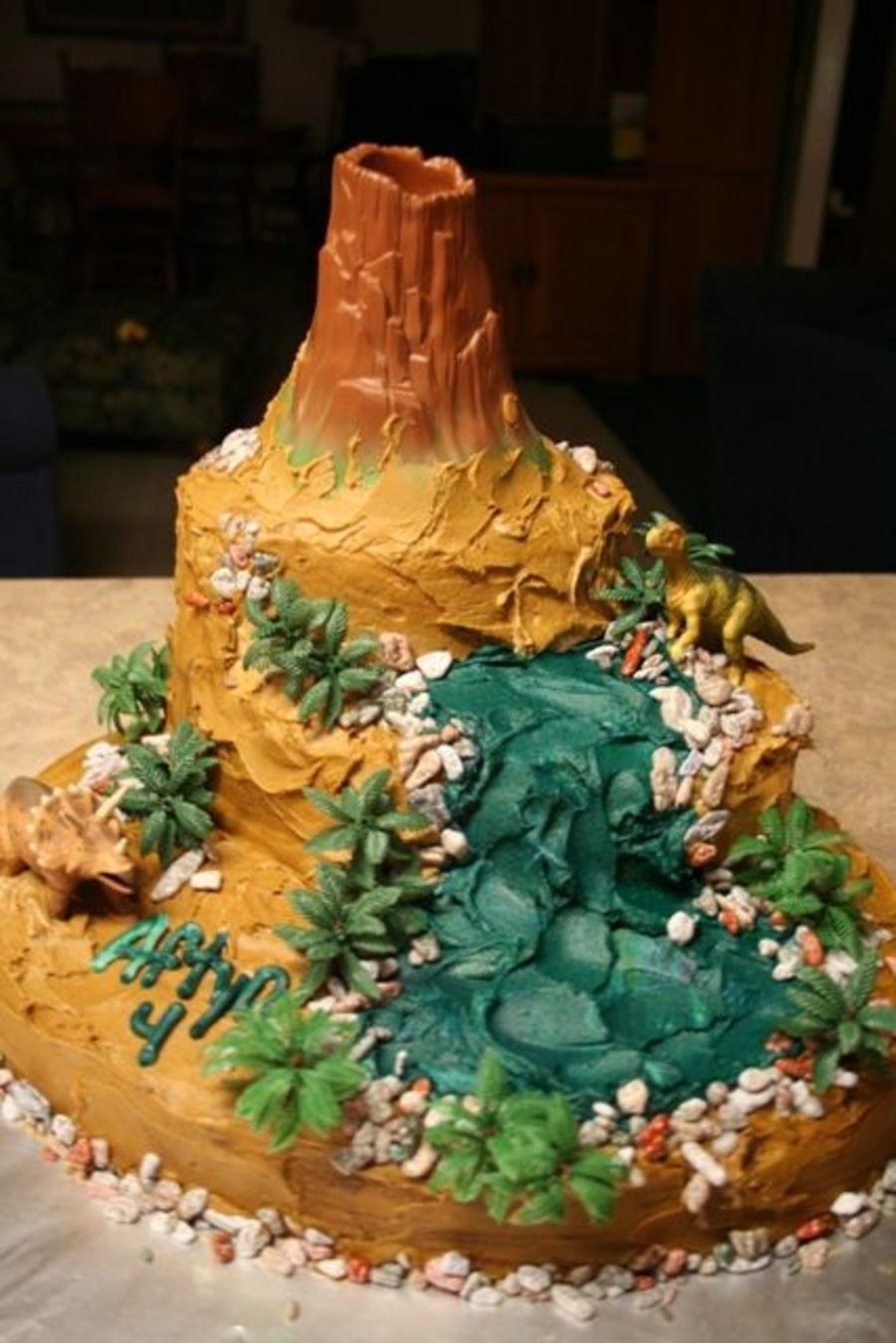 three cakes stacked and covered with icing. chocolate rocks and more dinos were added later