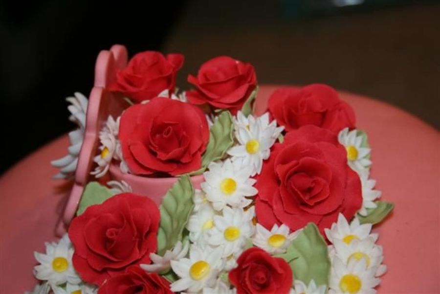 This is a close up shot of the flowers from my Wilton FGP Course final. The daisies are gumpaste and the roses are fondant. The trinket box is a 50/50 mix of gumpaste and fondant.