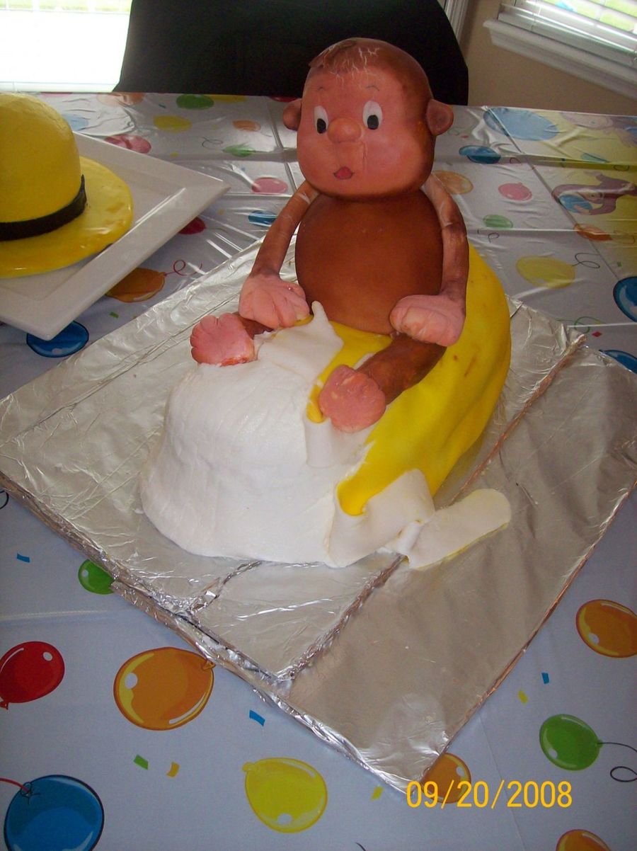 I did this for my son's 1st birthday. The banana is covered in bc with a fondant peel, Curious George is RKT with some copper wire arms covered in fondant. I was up until 2am finishing him and woke up to find him completely collapsed in the morning (hence the indentations on his face) + I had windows open in my house and the BC started softening. on the banana... what a disaster! You can see his yellow hat smash cake in the background. Nothing special to that.