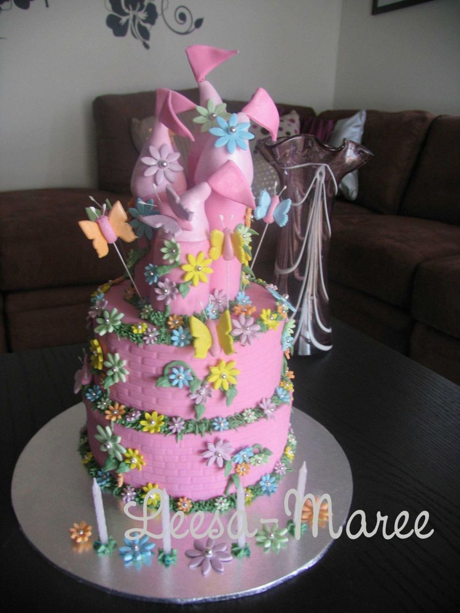 Two tier castle cake covered with fondant. Fondant butterflies, flowers and turrets. Grass, vines and leaves were all done in royal icing. Had so much fun with this! I'm still learning but wanted to share!