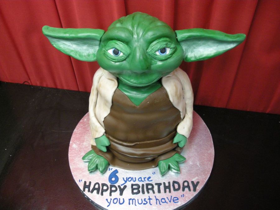 I found a tutorial online that showed how to make yoda. I stacked 8-inch round cakes-I used 5 layeres stacked with another dome shaped on top. The head I shaped out of rice crispies. All covered in fondant- the ears I made out of gumpaste so they would get hard and skewered them all the way into head.