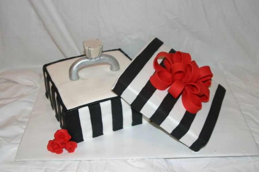 Box made to look like a local jewelers box. The guy who ordered the cake used it to propose to his girlfriend! Fondant stripes and bow. Gumpaste ring and top.