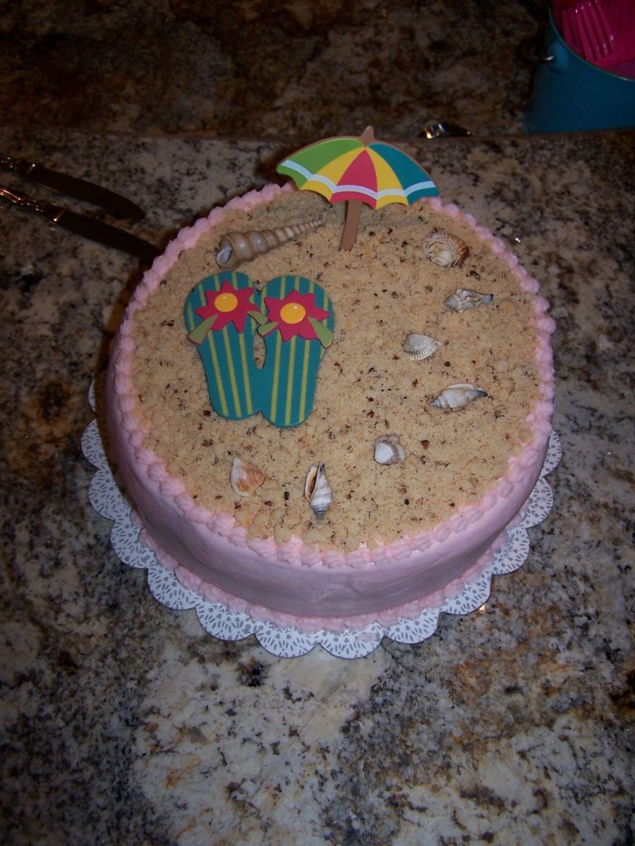 10" round cake decorated with pink lemonade buttercream and crushed pecan sandies for the beach.