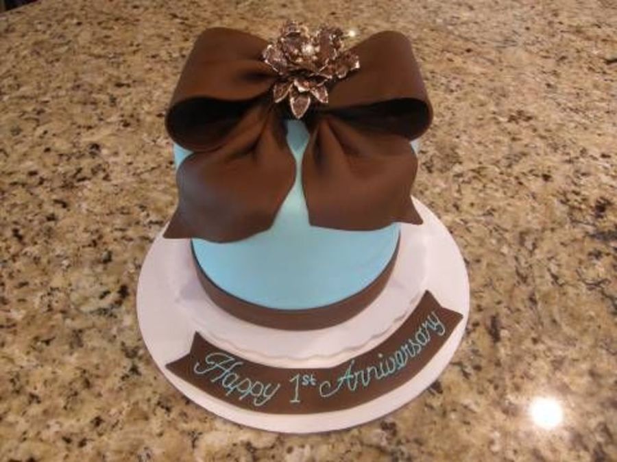 This is a wedding cake top I made for a couple who was having a 1st anniversary. I loved working with these colors. Fondant covered cake and fondant bow. Non edible pin in the middle of the bow. TFL