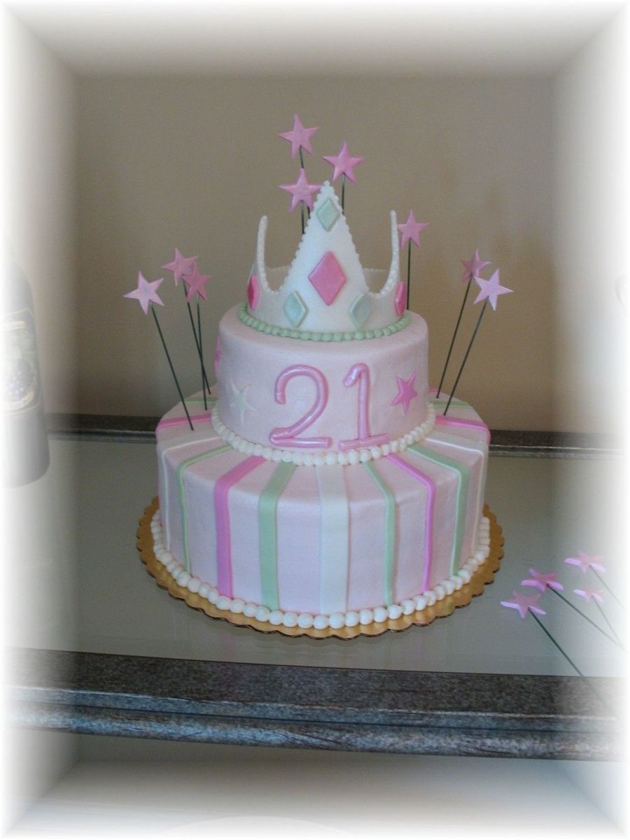 Based on a deisgn from the Pink Cake Box. 6" on 10". BC with fondant details. Stars are GP. Tiara is GP. Luster dust on everything. My cousin actually put the crown on her head while she cut the cake (too funny!). I loved the color combo on this cake.