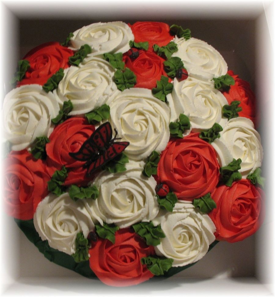 19 regular sized cupccake. Tip 1M for the roses. The are sitting in 19 5oz plastic cups stapled together in a circle. butterflies are candy melts. Lady bugs are M&Ms. Red on cupcakes was airbrushed