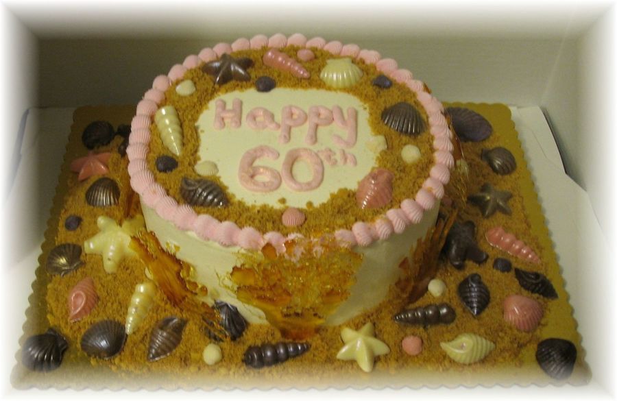 10" round. Candy melt shells. Poured sugar coral. Sand is a combo of Lorna Dunes, brown sugar & Pecan Sandies. Fun summer cake