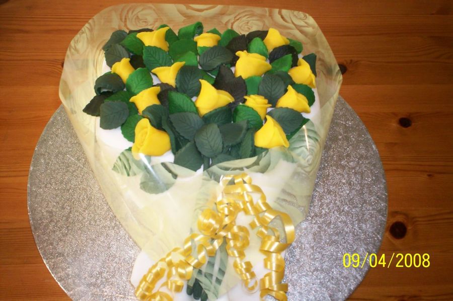 This was a fruit cake and I just covered it with roses and leaves made from marzipan. To add that special authentic touch I purchased some florist cellophane and a card to make it look like a real bouquet.