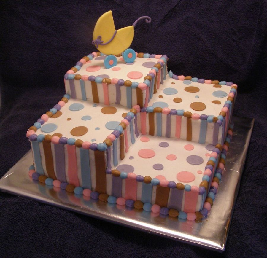 This was for a girl who didn't know the sex of her baby. So that's why were are boy and girl colors in this cake. Iced in buttercream w/ MMF accents.