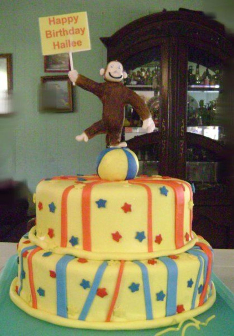 Curious George for a Second Birthday. George is made out of MM fondant with a skewer inside of him and plastic rolly eyes. We made a isgn on the computer for him to hold in his hand that was removed and replaced with 2 candles when it was that time.