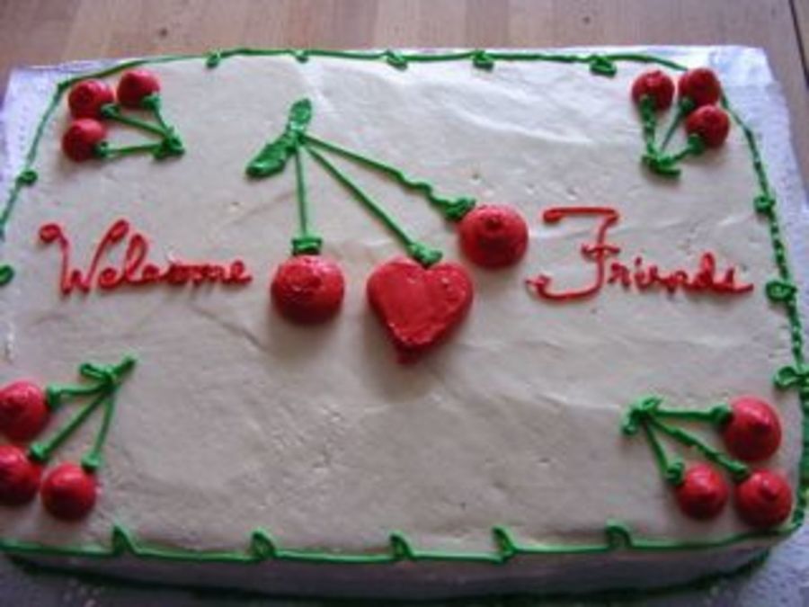 Buttermilk cake filled with cherry jam, and decorated with cherries for theme. Really nice "just because" cake for friends coming 'round...
