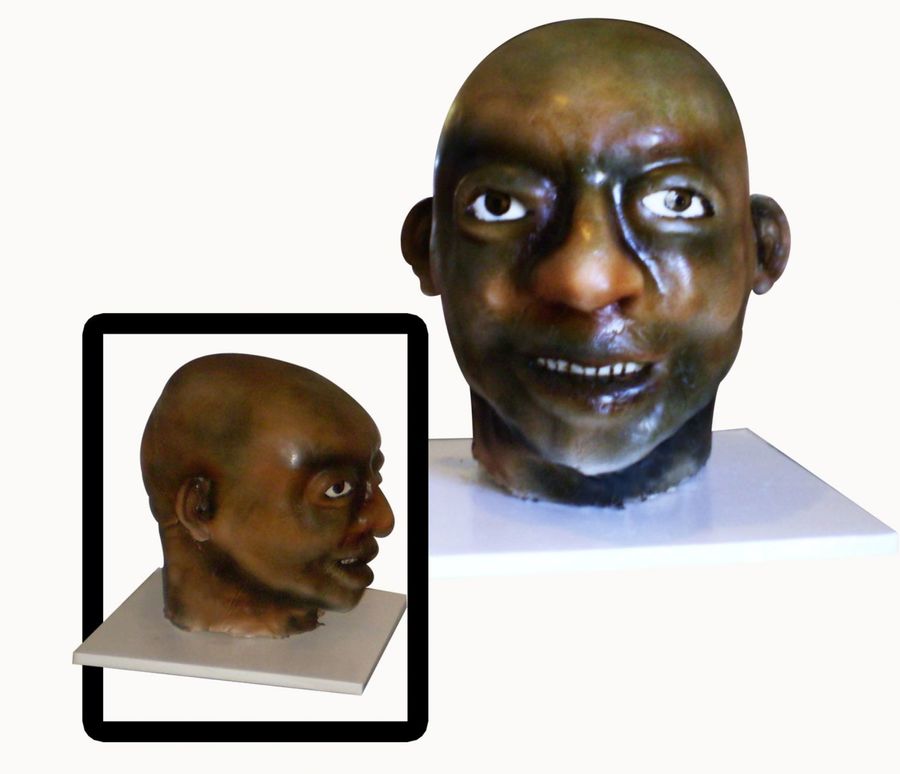 This is a chocolate chunk cake made with Godiva Liquor (chocolate and Mocha). The neck is made with Rice Krispies and the detailing is made with gum paste (i.e. mouth, nose, ears, eyes) We had less than 2 days notice to pull off this cake. We made a special board to balance the head and counter the weight from tipping over. The home-made fondant was sprayed with a mixture of colors to give it the "realistic look" that we were looking for. If you have any questions, I would be glad to help. :)