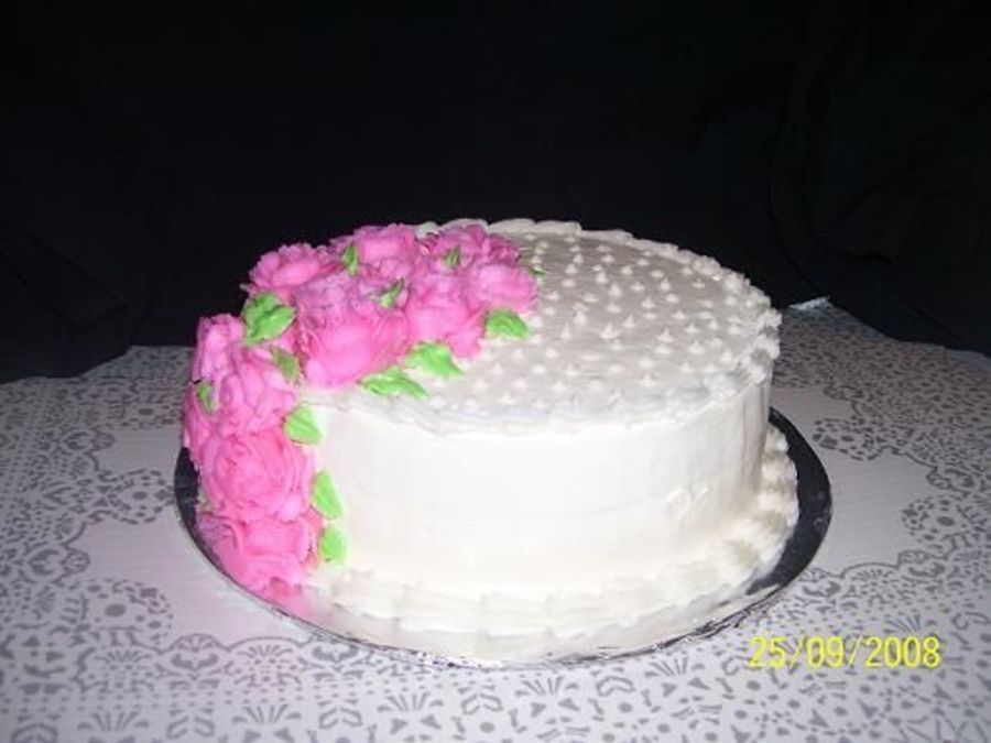 This was my final cake for Wilton Class 1. It's just a plain old 8" white cake with butterceam filling ( I didn't feel well, so got lazy). I used class recipe except used butter instead of shortening. It tasted much better but never would crust, so it was a real pain trying to get it smooth. The roses and shells were all (normal) class recipe. Let me know what ya think!