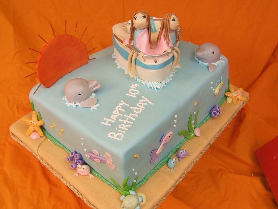 I did this for my sisters friends boyfrinds daughters 10 b-day. Chocolate cake covered in mmf with mmf and gumpast figures. Boat is rice crisy. TFL