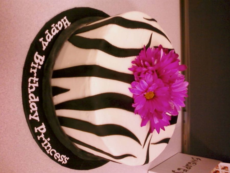 This is a one-tier 3-layer white chocolate cake with raspberry filling and vanilla buttercream icing. The black zebra print and bottom rope are Satin Ice fondant, pre-colored black mind you, because that is HARD to color! The flowers are fresh Gerbera Daisies just placed atop the cake. Thanks for looking! :)