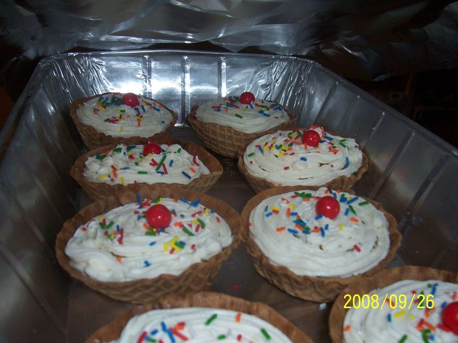 Miniature version of icecream sundaes, I made for a prechool birthday party. confetti cake with cream cheese icing. Everyone loved them.