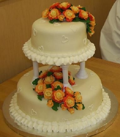 This is the cake I did for my wilton course 3 final cake. Its covered in MMF, white buttercream icing border and piped heart outlines, and is decorated with fondant roses made to resemble the judy garland roses my friend loves so much. This was my first tiered cake, my first attempt at making and working with MMF, as well as decorating with the fondant roses. I had a great time with it and I am very pleased with the results. All comments appreciated. Thanks for looking!