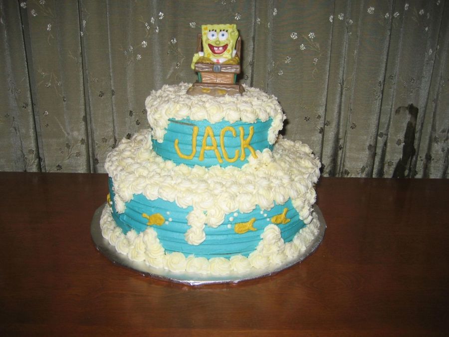 2 tiered cake with spongebob topper made with BC. I saw this cake on here and loved the simplicity of it. However I didn't save the picture and can't give proper credit...but thank you for inspiring me!! My son loved it!