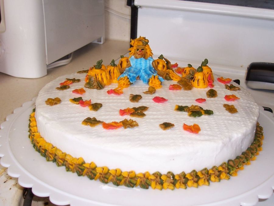 scarecrow sitting in a pumpkin patch. with leaves around. Everything is made out of buttercream