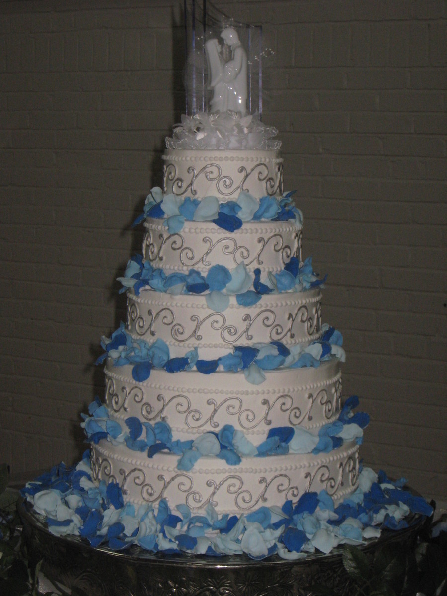 14",12",10",8",6" iced in buttercream. Scrolls in buttercream painted with silver/super pearl l/d. Fondant/gumpaste petals.