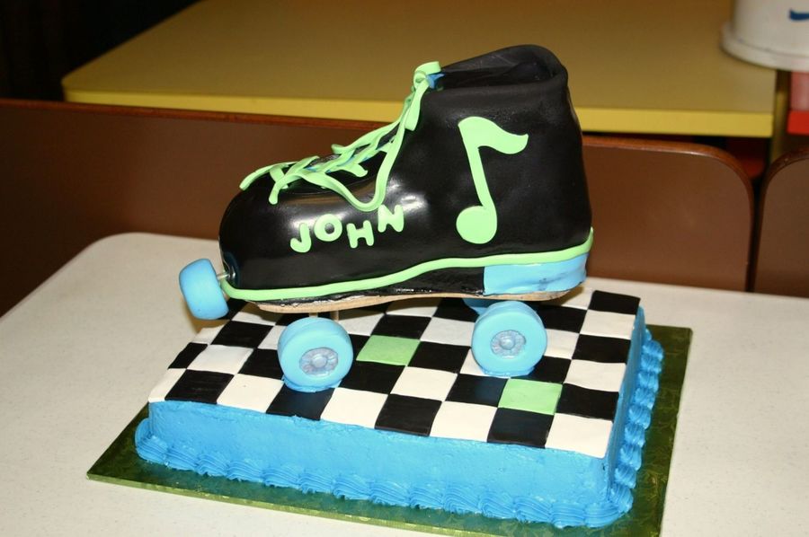 Skate is white cake covered with fondant. Floor is chocolate cake with buttercream sides, fondant checkerboard. Wheels were made of fondant. My first roller skate; I was terrified!