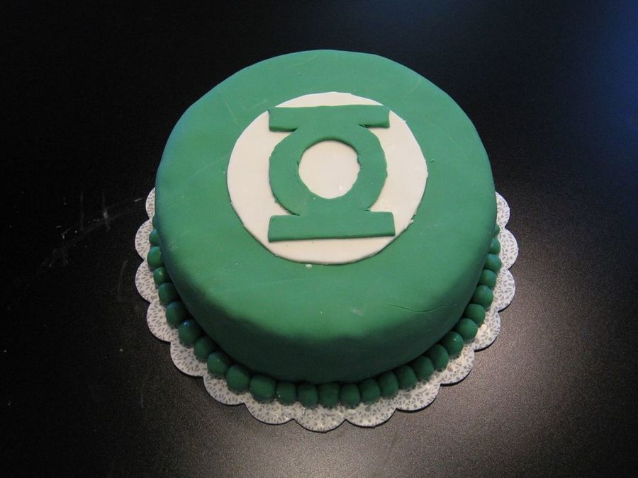 For my husband the comic book geek. This is a lemon cake with a lemon curd filling. It is covered in fondant with the Green Lantern logo on top.