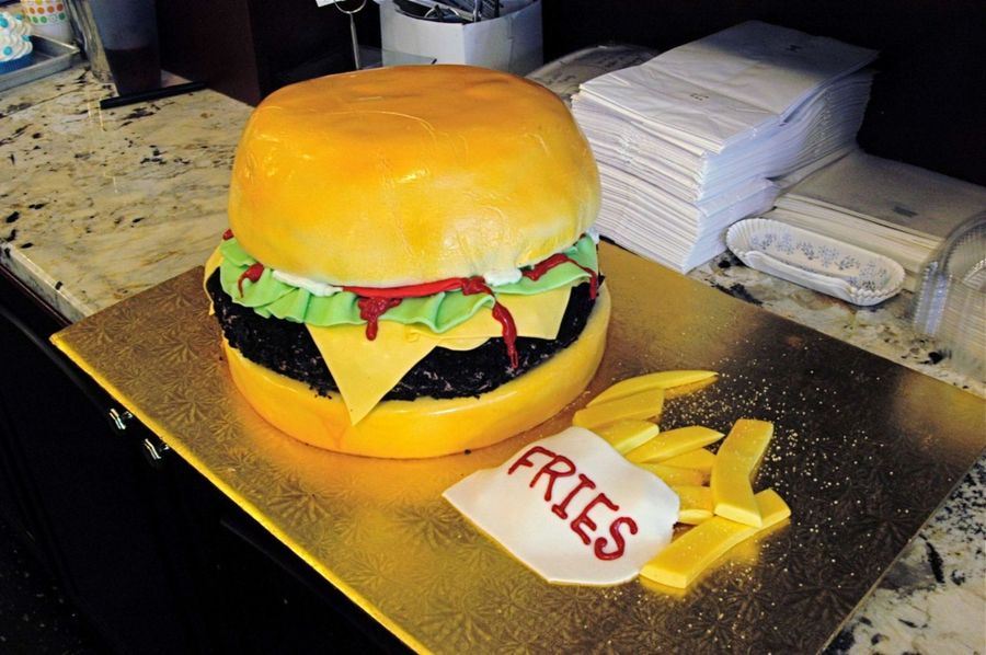 Cheeseburger with fries...wow! this cake is so much easier once you've got a fondant sheeter.