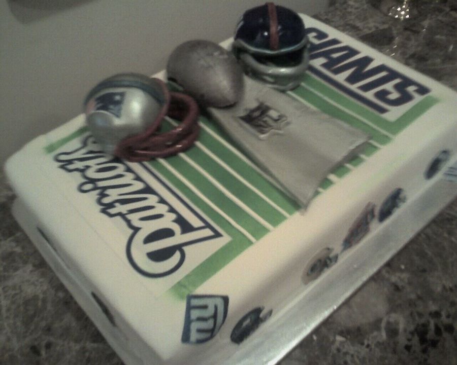 I made this for a friend's super bowl party. I should have made the trophy out of Rice Krispies Treats (but I've never worked with that before). The football was molded in chocolate then airbrushed silver. The rest of the cake was covered in MMF - same for the helmets. I've put up a closeup of the Giants' helmet.