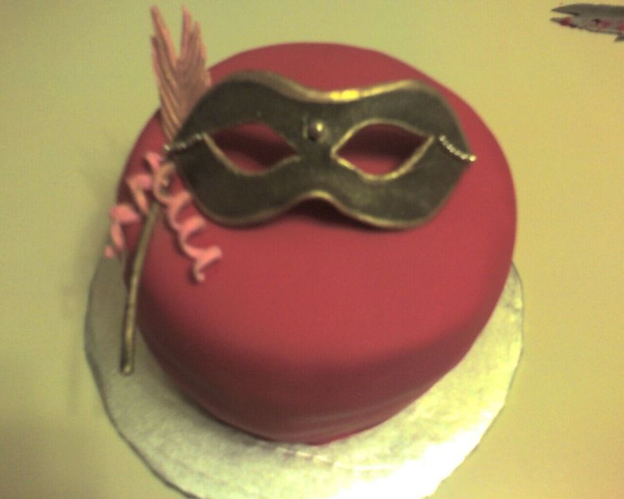 Sample cake for customer tasting. Masked ball cake to be done in January. Chocolate cake with Red Fondant. I buy the Red Satin Ice. It's easier to get a nice, true red. The mask is chocolate fondant.