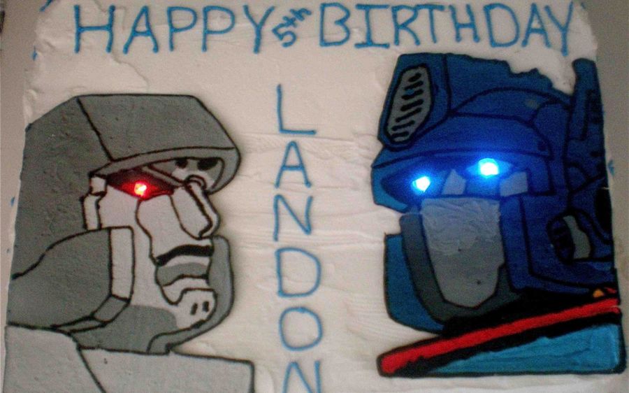 I made a chocolate chocolate chip cake with cream cheese buttercream icing. This was my first time using the royal icing transfer technique. I think it came out well. :) I bought LED lights online and buried them in the cake, then set the characters over the lights. When doing the transfers I made sure to reserve an open space for the light to come through. It was the day before we moved across country, so I only had a plastic knife to frost with and a ziplock back to write with!
