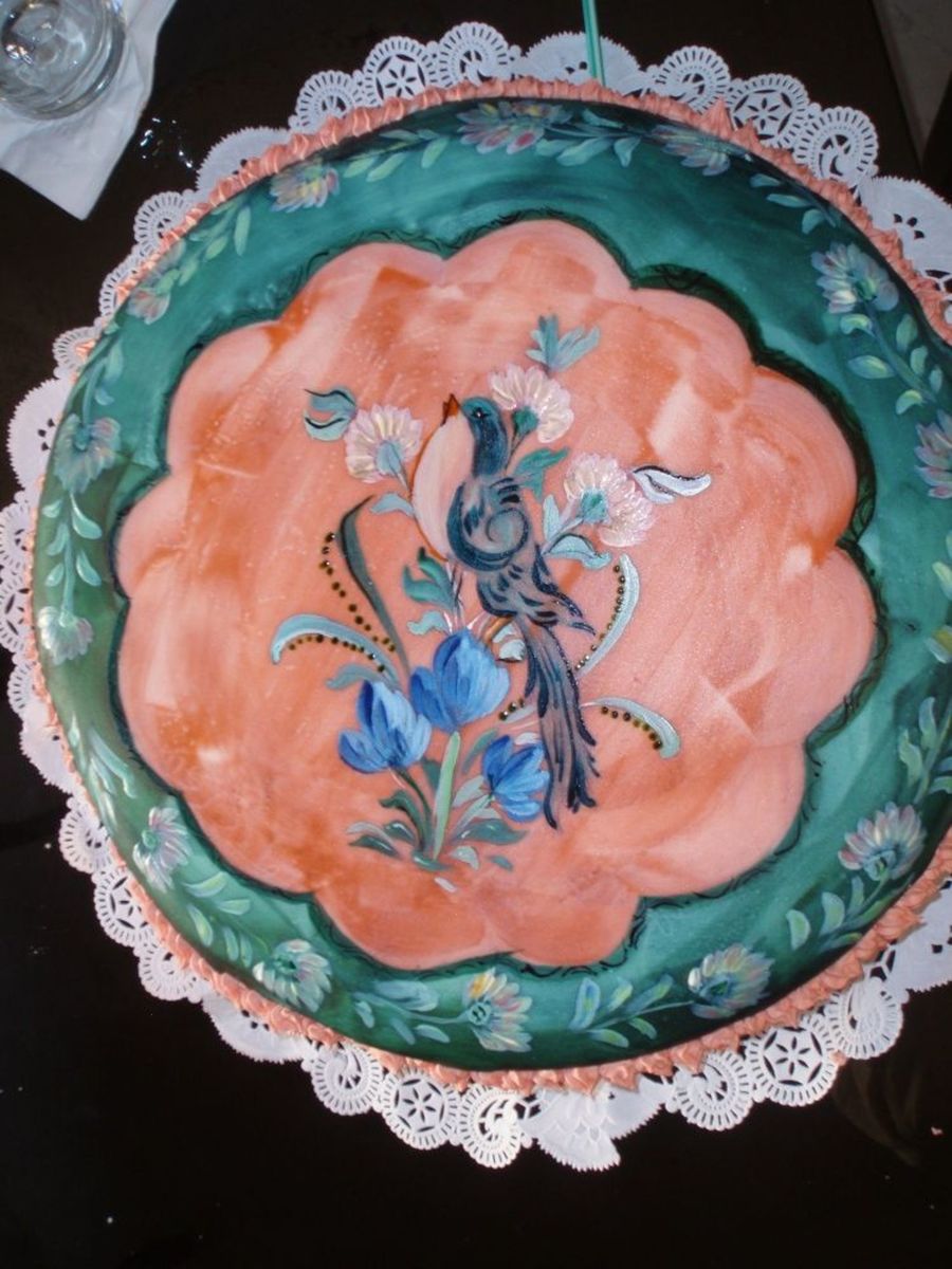 this cake looks lake a hand paint plate, it is a bird, and the style of the paint is like from people from central europe mountains tirol. it was made for my friend jayne