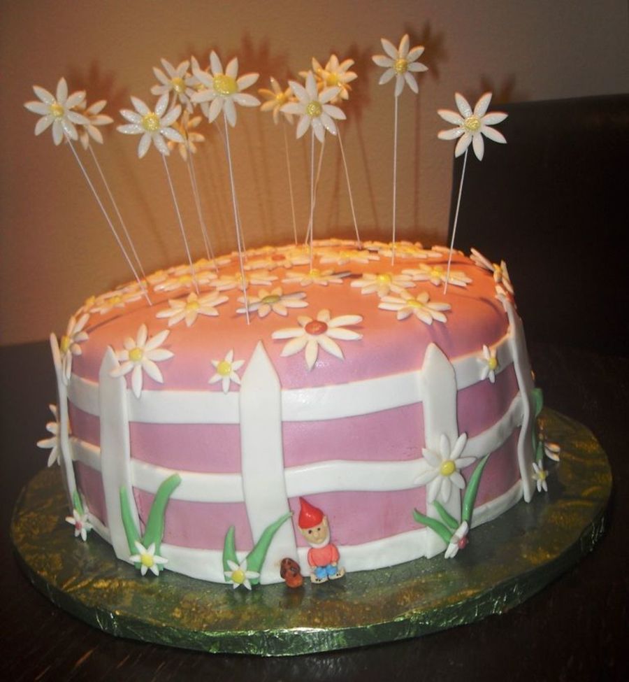 Banana cake with whip cream filling and milk chocolate buttercream. The flowers and gnome are gumpaste. All other decor is MMF.