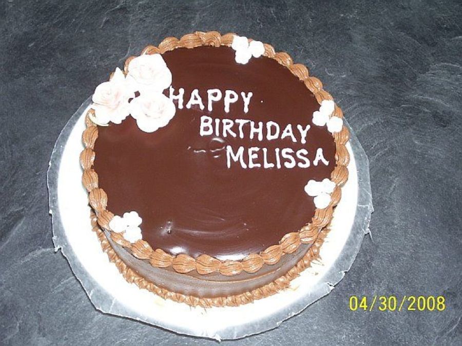 Double chocolate cake with chocolate chips. Chocolate buttercream frosting, chocolate ganache topping. Fondant roses (Not clear in the picture)