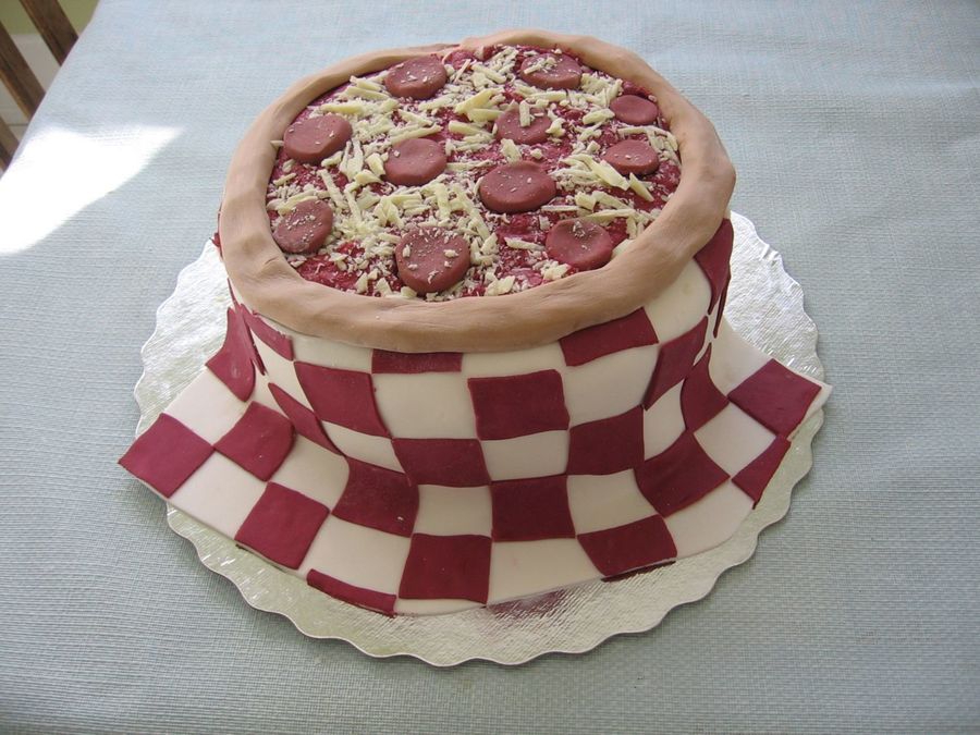 pizza cake - fondant tablecloth, pepperoni and crust. cheese is white chocolate. Thank you for the inspiration - I loved the tablecloth idea.