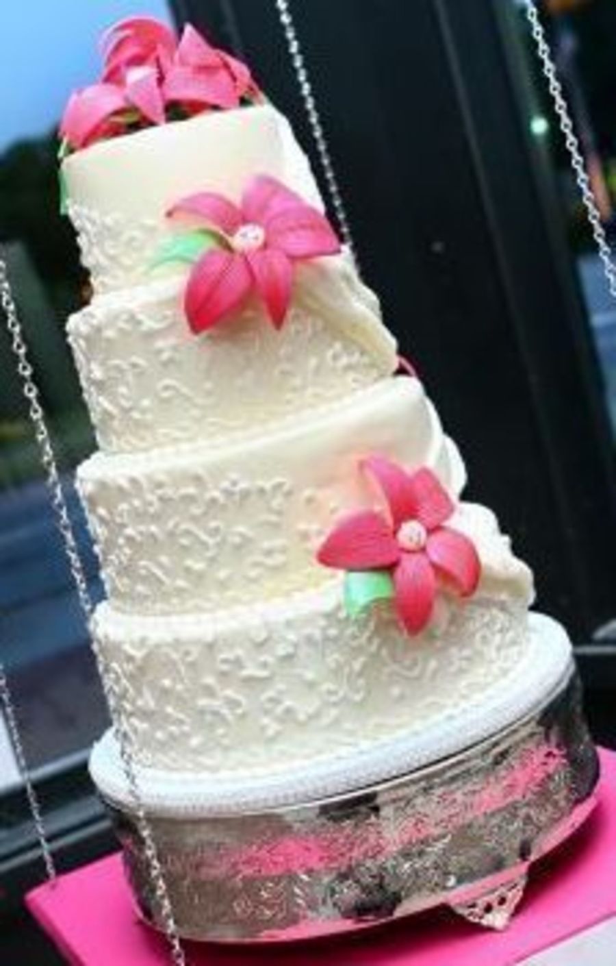 This is my entry for the 2008 SC State Fair. It was also on display at an event hosted by a wedding planner. This picture was taken by a professional photographer. They didn't really get the front of the cake, but it is still a great picture. It is 6-8-10-12" cake forms covered in MMF. The drape (you can hardly see) was MMF with clear crystal sprinkles pressed in to it. The gumpaste flowers are meant to be fictional and the centers had crystal sprinkles and silver dragees in them. TFL