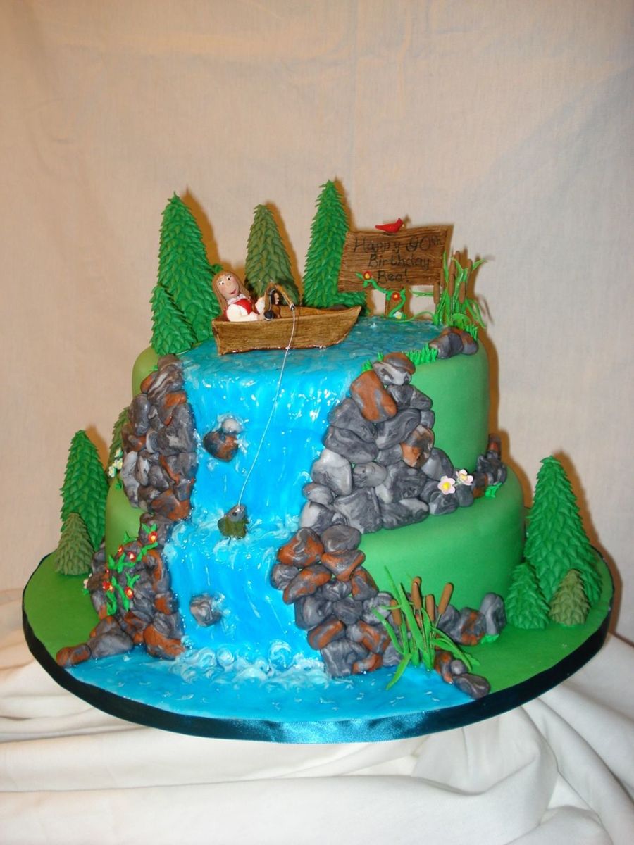 This is a funny cake. Customer wanted me to tie in a lot of different things about the birthday-girl....she loves to fish, had a ukulele band, and is sweedish, so I made her fishing, she has a ukulele in the other hand, and is wearing the sweedish national dress. All figures are fondant. Pumpkin cake with bavarian cream filling. 11" and 9" rounds.