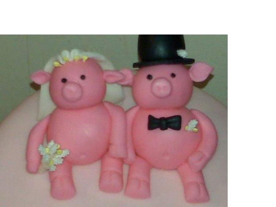 Fondant bride and groom pigs used to top a wedding rehearsal dinner cake.