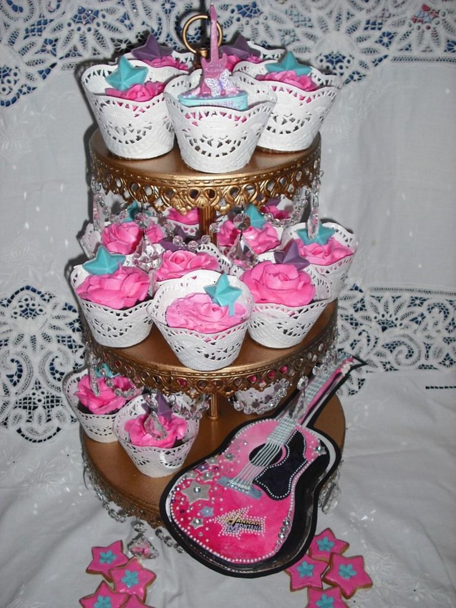 These are the cupcakes that I made to go with the birthday cake tomorrow.Choco-choco-chip w/pink buttercream roses and blue or purple choco stars atop. (The top cupcake has her candle)I made some pink sugar cookies to throw in, along with a pink guitar (gumpaste & royal icing) for theme's sake!