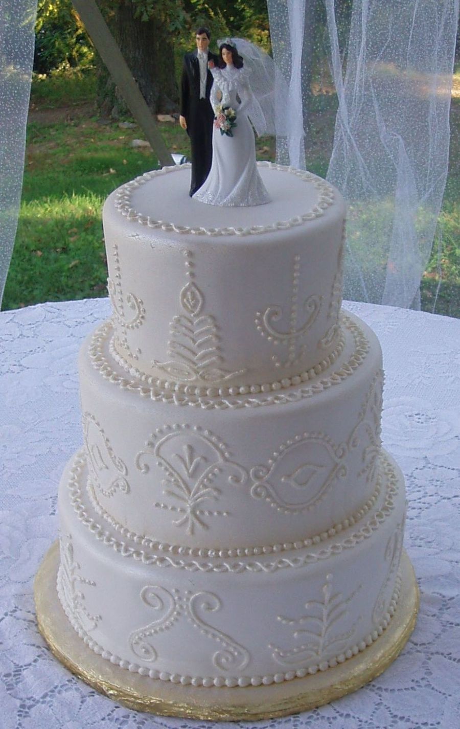 This is Pink Champagne Cake w/ Champagne Mousse Filling, Iced in Buttercream & covered in Fondant. This is based off the bride's dress but with a Henna spin. I love the white on white for this design. Thanks so much for looking!