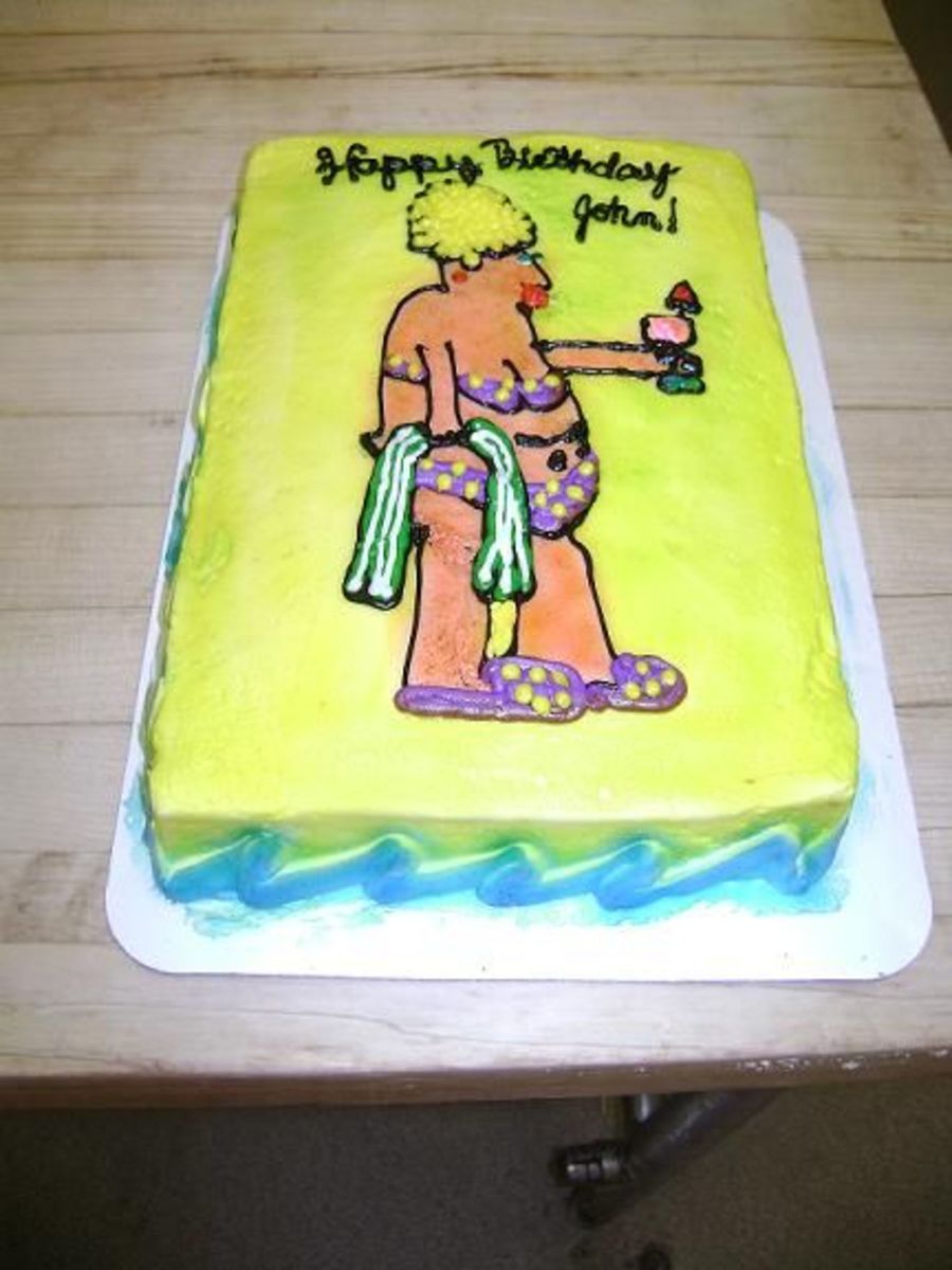 vanilla 1/4 sheet cake with buttercream. the chunky lady in a bikini is an inside joke between the birthday boy so she thought it would be funny. the design was done freehand